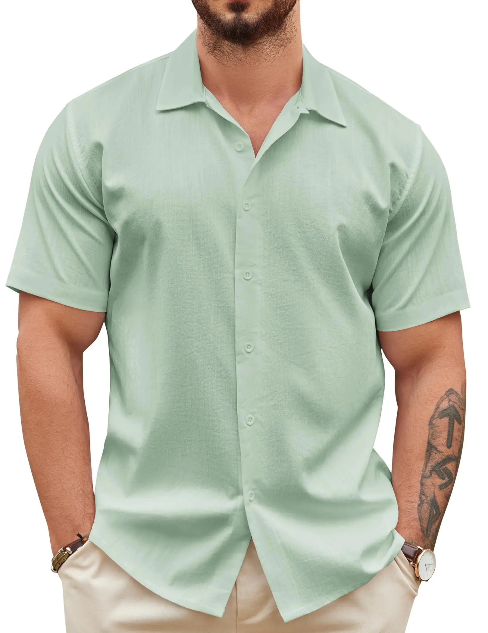 Description Royalapparel Mens Short Sleeve Shirts Luxury linen fabrics Casual Button Down Shirts Summer Beach Shirt Lightweight Textured Wrinkle Free Dress ShirtsBrand Royalapparel is a mens wear design fashion brand focusing on high quality of clothing. Customer first precise craftsmanship are our eternal pursuitFeaturesUnique Texture Spread Collar Short Sleeve Button Down Closure Regular FitSoft Comfortable Lightweight Breathable Skin-friendlyPerfect for casual work travel party outdoor vacation beach wedding resort etcMachine wash; H